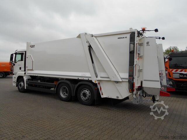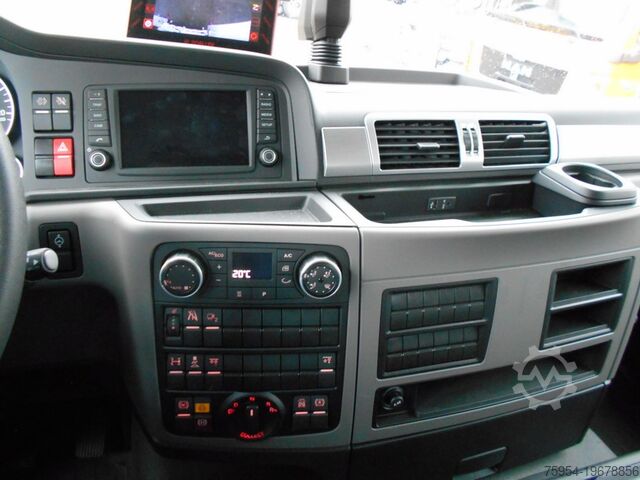 Diesel engine D2676LF80, reinforced clutch, front axle with leaf suspension, rear axles fully air-suspended, steered trailing axle, differential lock, hill start assist, MAN BrakeMatic, bus stop brake, engine brake, disc brakes, lane departure warning, emergency brake signal, ABS, ASR, ESP, heated fuel filter, daytime running lights, cab with 2 seats, heated driver's comfort seat, air-suspended comfort passenger seat, central locking with remote control, tinted windows, heated and electrically adjustable mirrors, electric windows, rear wall window, multifunction steering wheel, immobilizer, cool box, automatic climate control, roof hatch, cruise control, MAN Media Truck Advanced radio, digital tachograph, speed limiter, OBU preparation, sun visor.