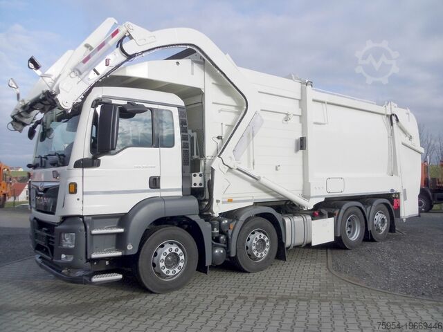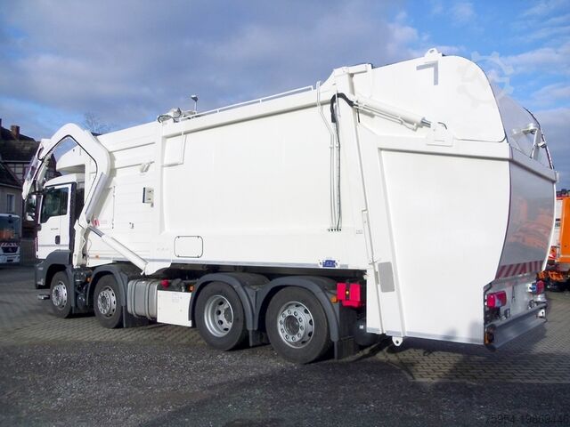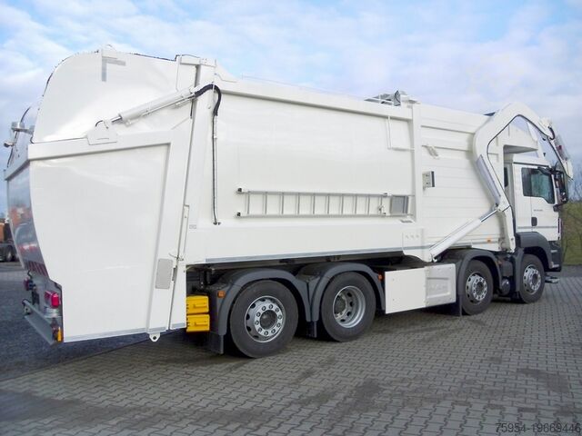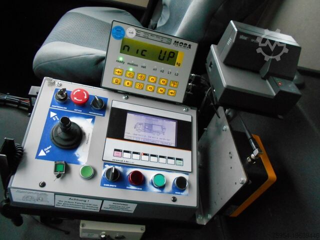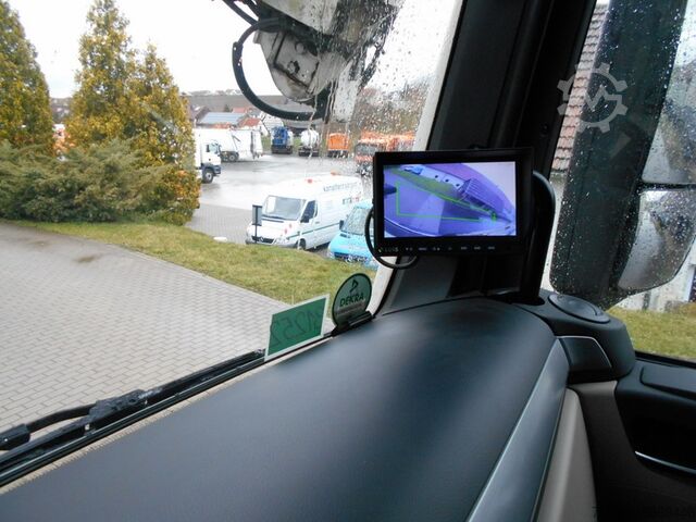 ABS, ASR, disc brakes, EDC engine control, air-suspended rear axle, steered trailing axle, differential lock, flame start system, 310-liter aluminum fuel tank + 35-liter AdBlue, comfortable driver's seat, adjustable steering wheel, electric windows, heated and electrically adjustable mirrors, adjustable and heated wide-angle mirrors, air conditioning, fine/pollen filter, tinted windows, roller blind, roof hatch, headlight range adjustment, rocker arm brake, on-board computer, digital speedometer, radio, entry lighting, cruise control, traction control, central locking, work lights, rotating beacon, reversing lights, adjustable fork on one side, fork inner dimension 1,280 - 1,880 mm, 1.1-inch mount, follower panel, TFT/color camera system, rear/wide camera, dump camera, front camera, remote control, ladder, storage box, fire extinguisher, Moba scales