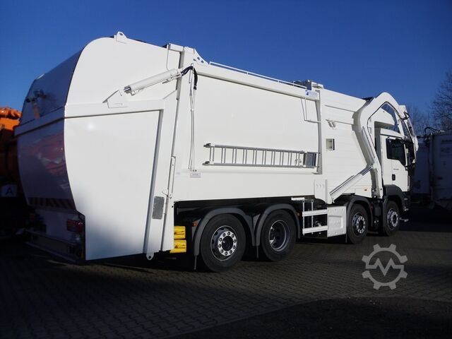Rear module: "XL-Whale", net loading volume 37.5 m³; net feed hopper volume: 9.6 m³; compactor plate with floor scraper; hydraulically foldable cab protection roof; driver's cab protection roof made of GRP; follower panel with inverted cab protection roof; third flap as wind deflector; quiet and low-wear rotary vane pump; user-friendly control unit, all loading functions operable via a single joystick and operator guidance via color display; unloading can be operated from the cab; self-diagnosis system with plain text display; fork, adjustable on both sides (adjustment range 1,280 mm - 1,890 mm) with integrated 1.1-type receptacle (bin according to 840 2-3); LED arm marker lights, without indicators; 2 arm guide rollers in tipping position; 1x LED rotating beacon mounted high at the rear; 1x LED work light at the hopper; 1x LED work light behind the cab; 2x LED goose-neck lights, lower position marker lights; 2x LED upper marker lights; 1 LED rotating beacon rear right lower; 2 LED strobe lights front under the protective roof; 2 LED work lights at the front; 2 LED work lights for illuminating the rear axle with automatic shutoff at 15 km/h; 2 LED reversing lights, left and right, coupled with reverse gear; central lubrication system incl. electric pump; camera system – front camera, rear area monitoring, and roof-mounted camera for hopper feed; radio remote control with positional binding; speed increase via radio remote control; contour marking; mounting bracket for shovel and broom; aluminum ladder with ascent guard; 2x A-sign markings; fork scale – MOBA.