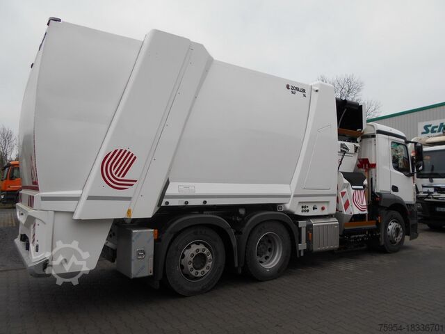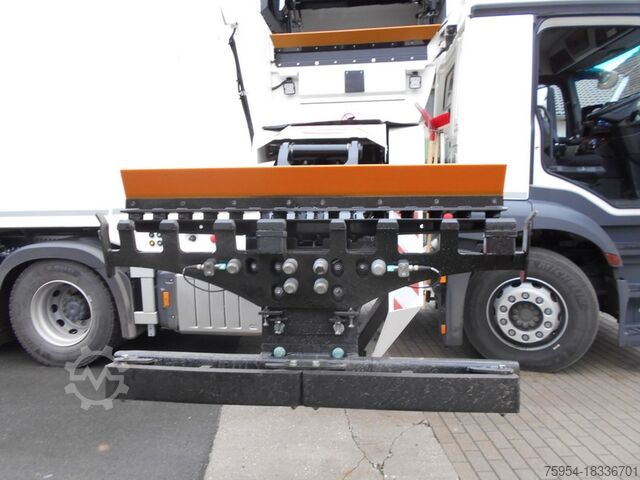 Right-hand drive, 26 t weight variant, OM470 engine, disc brakes, stop brake, Active Brake Assist 5, ABS, ASR, ESP, Lane Keeping Assist, traction control, 7.5 t single-leaf front axle, air-sprung rear axles, 13 t rear axle with differential lock, steerable and load-relieving 7.5 t trailing axle, axle load measuring system, regulated water pump, daytime running lights, rain sensor.