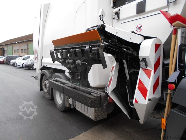M-ClassicSpace cab (width 2300 mm, tunnel 320 mm), 2 seats, multimedia cockpit, tinted windshield, roof hatch, electrically heated and adjustable front mirror, power windows, comfort locking system with central locking, driver's comfort suspension seat, multifunction steering wheel, emergency hazard warning lights, FleetBoard Eco Support, Multimedia Radio Touch, trip computer, 12/24 V sockets in the passenger footwell, circuit breakers, pre-installation Toll collection, air conditioning, cruise control, attention assist, speed limiter, residual heat utilization, compressed air connection in the cab.