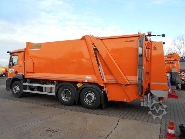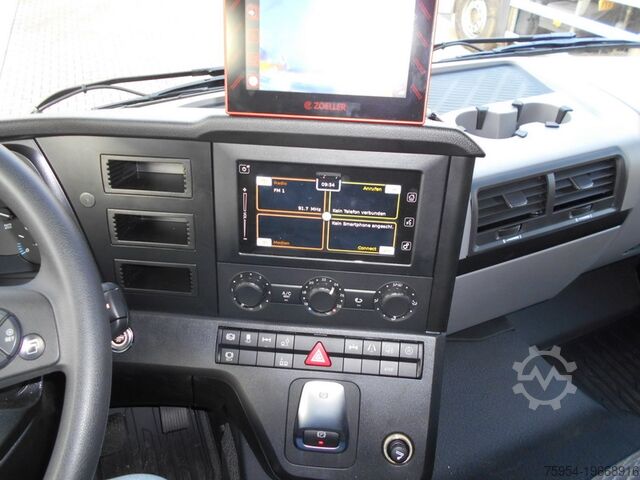 Cranked front axle, differential lock, steered and liftable trailing axle, tires 315/80R22.5 and 385/65R22.5, 290 l aluminum tank, 60 l AdBlue tank, underride guard, disc brakes, ABS, ASR, bus stop brake, speed limiter, driver comfort seat, multifunction steering wheel, electric windows, OBD, radio, entry lighting, air conditioning, tinted windows, roof hatch, sun visor, heated front mirror, ESP, lane departure warning system, cruise control, hill-start assist, attention assist, turn assist system.