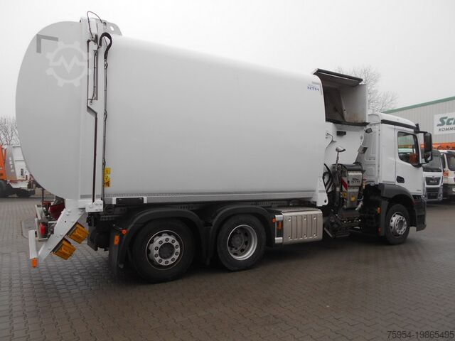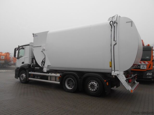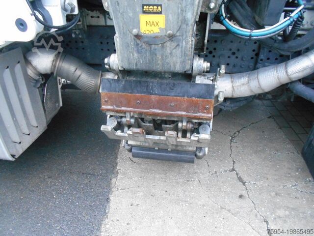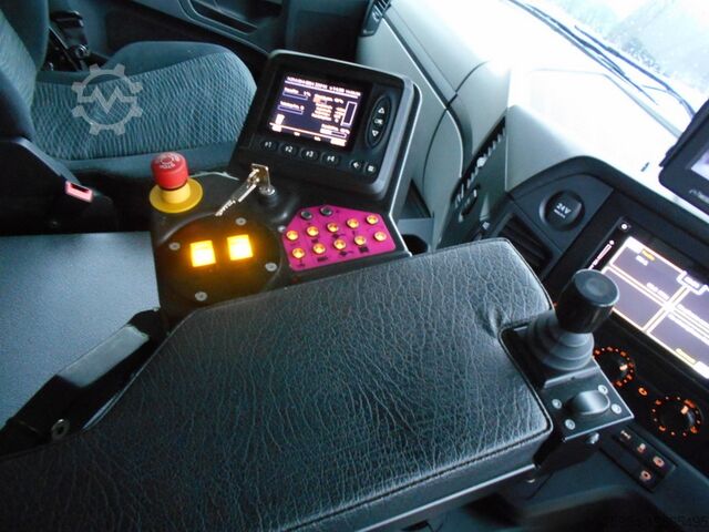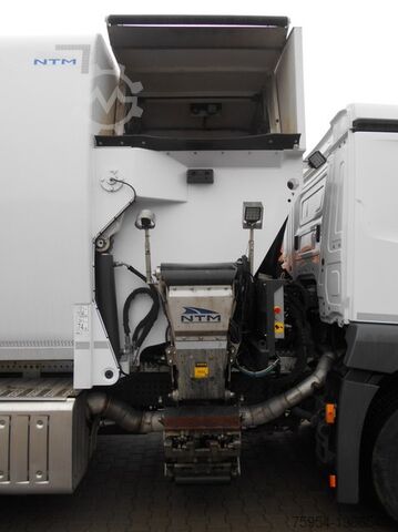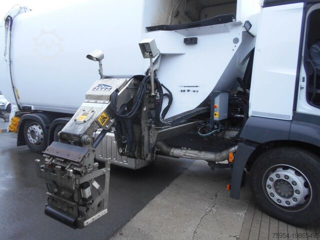Side loader NTM OM-SBH-420-DK-RT-FD 27 m³ with comb-type lifter, pendulum compactor, press chamber volume: 3.6 m³, compaction ratio 1:4, lifter lifting capacity approx. 420 kg, reach approx. 2,300 mm incl. hydraulic side adjustment, short-range pickup for confined spaces, double comb pickup for 2 MGB containers DIN 30740 / EN840 80–240 litres DIN 30700 / EN840, with folding or sliding lids and comb bar, container stop for sliding and folding lid containers up to 1,100L. Storage chamber: approx. 27 m³. Collection chamber tilted for emptying by hydraulic cylinder, camera on the pendulum press area, reversing camera, LED work lights.