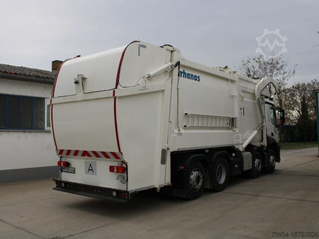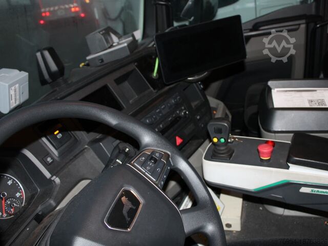 Rear section: "XL-Whale" net loading volume 37.5 m³; net filling shaft volume: 9.6 m³; press shield with ground scraper; hydraulically folding cab canopy; follower panel with inverted cab canopy. Quiet and low-wear vane pump; clearly arranged control unit, all loading functions operated with a single control lever (joystick) and operator guidance via color display; unloading function operated from the driver's cab; self-diagnosis system with plain text display; fork, one-sided adjustment (adjustment range 1,280 mm - 1,800 mm) and integrated 1.1-inch receiver (container according to 840 2-3); LED arm marker lights, without indicators; 2 arm guide rollers in tilt position; 1x LED rotating beacon mounted at the top of the rear; 1x LED work light on the filler chute; 1x LED work light behind the driver's cab; 2x LED gooseneck lights, lower marker lights; 2x LED marker lights at the top, 1 LED rotating beacon at the rear bottom right, 2 LED flashing lights at the front under the protective roof, 2 LED work lights at the front, 2 LED work lights for illuminating the rear axle with 15 km/h cut-off, 2 LED reversing lights on both sides, coupled with reverse gear, central lubrication system including electric pump, camera system - front camera, rear area monitoring and roof camera for the filler shaft, radio remote control with position binding, speed increase via radio remote control, contour marking, holder for shovel and broom; aluminum ladder with access limiter, 2 x A markings, fork scale C-TRACE