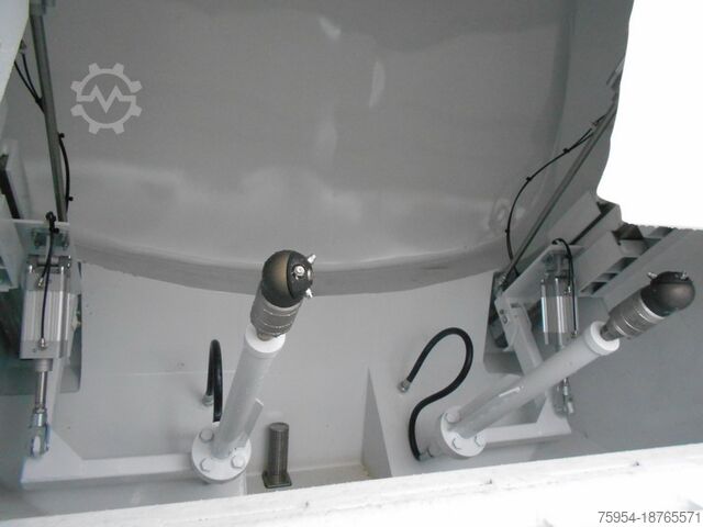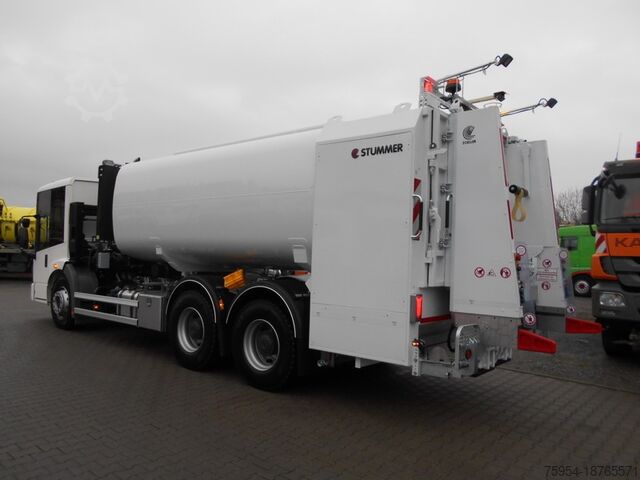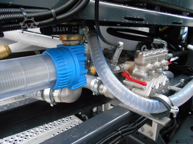 Body suitable for cleaning garbage containers MGB 80-1,300 liters; Tank: made of stainless steel 1.4301, 3mm thick, case-shaped, 3-cell, 3x manholes DN500 on the tank crown for each chamber; tank volume: approx. 8000 liters of fresh water, approx. 8000 liters of dirty water, and approx. 1200 liters for solids; cleaning chamber with corrosion protection; separate hot water tank, approx. 250 liters, mounted between the driver's cab and the tank container and filled from the fresh water tank via a feed pump; the automatically controlled heating system (Eberspächer auxiliary heater 25 KW) heats the washing water to approx. 45-50°; high-pressure pump: Uraca (approx. 120 l/min at 80-100 bar); pressure connection with shut-off valve and 4 m high-pressure hose, spray gun with bracket; hydraulically driven submersible pump for filling the service water chamber; control box mounted at the rear of the body; toolbox on the side of the chassis made of stainless steel; 2x rear work lights