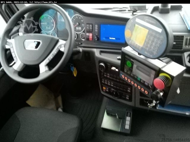 Exhaust with ground outlet, rear axle differential lock, multifunction steering wheel, emergency brake, sun visor, driver's air comfort seat, LED daytime running lights, perimeter/beacon lights, RIO Box, Truck Advanced radio with 7'' display including Europe navigation, Lane Guard, air pressure assist, Luis turning assistant HS Olympus Industrial 23 m³ with HS rear loader tipping system Comfortlift type U-K-KL EuroMax, suitable from 80 l to 5 m³, bulky waste collection with folding chute, comfort gearshift, centralized lubrication system. Tipping system lifts approx. 2 t, Welvaarts scale.