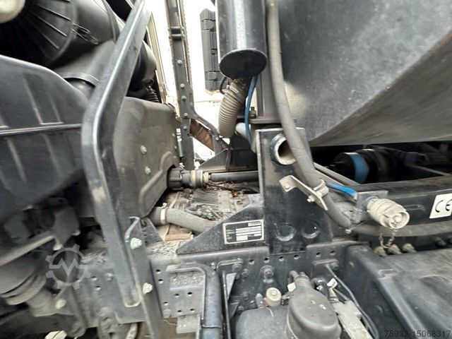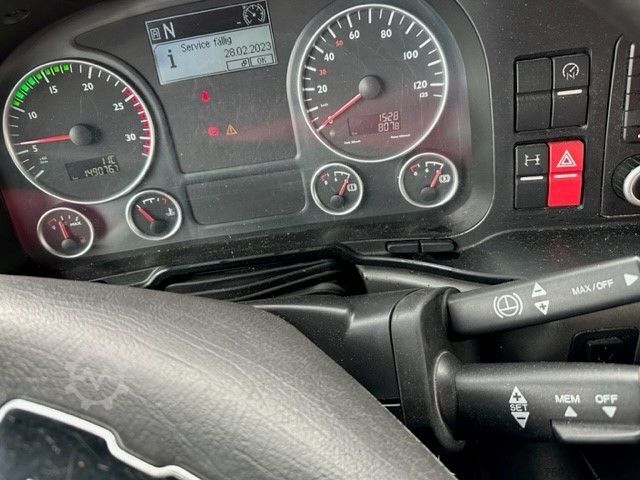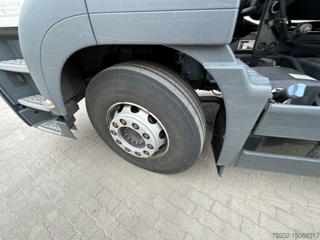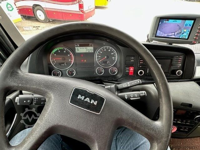 * Chassis equipment: VOK-09 cranked, parabolic spring 8.0t (2-leaf), electronic stability program (ESP), rear axle differential lock, trailing axle liftable, M-FHS (F99L/R17), dashboard center section 1 drawer, FHS rear wall 2 windows tinted, rear/wide-angle mirror heated/electrically adjustable, driver's comfort seat heated, radio with navigation system, passenger comfort seat, outside sun visor, curb mirror on the right heated/electrically adjustable, EU front mirror, toll collection OBU in DIN slot, roof antenna GPS/telephone, digital tachograph, daytime running lights, high beam/fog lights combined with cornering lights, side marker lights, 315/80 R 22.5, underrun protection/entrance support at the front, raised exhaust pipe on the right, 3-part rear fender, chassis with FHS, MAN TipMatic, ZF-Intarder, rotating beacons, work lights.