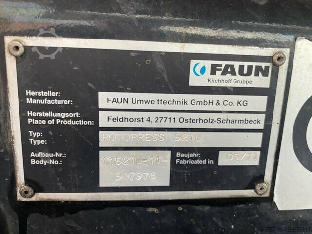 Faun Type 521L RotoPress with combined emptying Zöller Type 2301 for 120/240/1100 litre containers, steerable trailing axle, non-binding offer – subject to change and prior sale – sale is made with exclusion of any warranty – all information provided without guarantee!