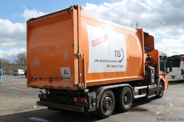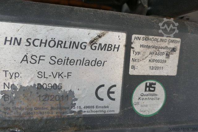 Кузов для сбора мусора HN SCHÖRLING, боковой погрузчик ASF, тип: SL-VK-F, кузов HN Schörling с задней разгрузкой типа HFA50P, макс. грузоподъемность 14 000 кг, камера переднего и заднего вида, двигатель Euro EEV, ABS, ASR, блокировка дифференциала HA , моторный тормоз, круиз-контроль, системы помощи при вождении, кондиционер, наружные зеркала с подогревом и электроприводом. регулируемый, электрический Стеклоподъемник в дверях водителя и пассажира, люк в крыше, комфортабельное сиденье водителя с подвеской, среднее сиденье, противотуманные фары, биксеноновые фары, проблесковый маячок, центральная система смазки, пневмоподвеска с устройством подъема и опускания VA+RA, управляемая последняя ось, бак автомобиля быть покрыт рекламой и/или иметь маркировку