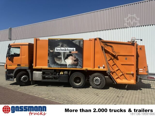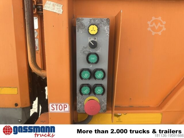 Vehicle location: Bovenden. Mercedes PowerShift II transmission, metal cab, 1x comfort seat, seat heating, electric mirrors, heated mirrors, electric window left, electric window right, air conditioning, cruise control, ABS (anti-lock braking system), traction control (ASR), constant throttle, PTO, differential lock, fog lights, rotating beacon, storage box, leaf-air suspension, low-noise G1, last axle steered (trailing), side aluminum underrun protection, roof hatch, green environmental badge.