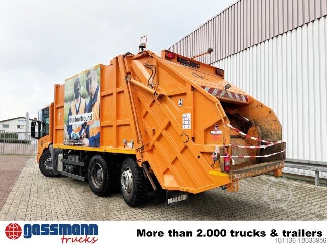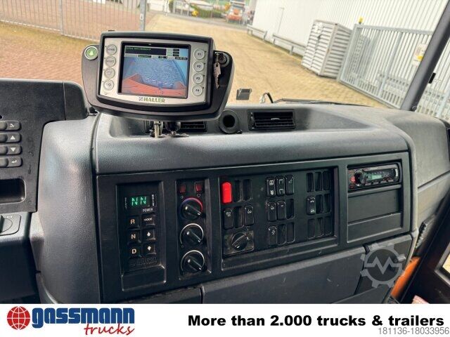Wheelbase: 3900 mm Body: Waste collection body Haller EEV engine, front axle air-sprung, 7.5 t front axle, rear axle H7 13 t disk wheel 300, axle load measuring device, Telligent trailing axle hydraulically steered, ABS, ASR, stop brake, disc brakes on front and rear axle, front underride guard, Stabilizer reinforced for NLA, lifting/lowering device, starting aid, parameterizable special module (PSM), pre-installation for toll collection, on-board diagnostics 2, Allison automatic transmission 3200 P, engine brake with constant throttle, automatic daytime running lights, radiator guard at the bottom, rear engine output torque 600 Nm.