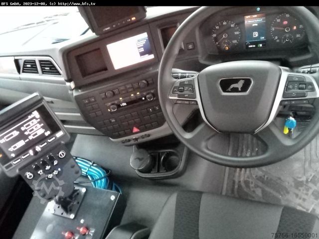 Steering arrangement RIGHT ASR, BrakeMatic, unison horn, ESS, EBA, MAN Tronic, radio MAN Media Truck 7 color display, LGS IV, BT FSE, TBM3/RIO ready, two engine variant, side brushes left and right. High-pressure washing system 100 bar with approx. 30 l/min, hand lance, nozzle bars on the sweeping material pick-up unit and roller brush.