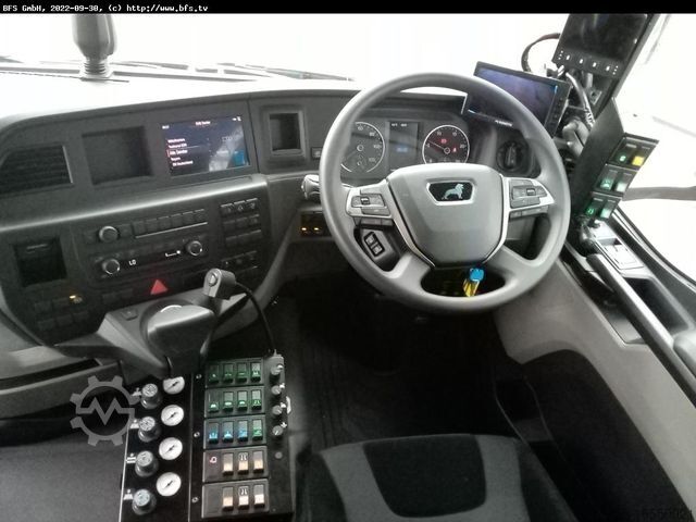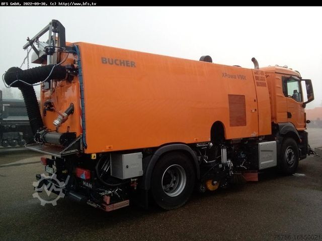 Steering arrangement RIGHT, operating hours: 2033 ASR, BrakeMatic, unison horn, ESS, EBA2, BT FSE, RIO Box, MAN Tronic, Radio MAN Media Truck 7- color display and navigation, LGS IV, two engine variant with built-in engine JCB 129 kW level 3b, front disc brush - sideways shiftable, double-sided sweepings pickup, HD washing system 200 bar, hydraulic suction hose boom at the rear, gross volume 9 m³, water system approx. 4320 liters, weed brush preparation, container 9 m³ volume, built-in engine JCB 129kW/level 3b, feeder brush fixed 5 x 1300mm, total water volume 4320 liters, fuel tank 350-400 liters, coated suction nozzles double-sided, 15m hose reel, 200 bar 106l/min, rear area observation, rear suction hose