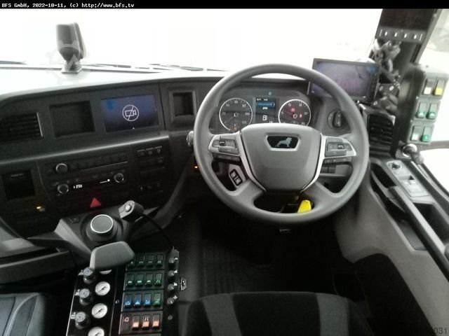 Steering arrangement RIGHT, operating hours: ASR, BrakeMatic, unison horn, ESS, EBA2, BT FSE, RIO Box, MAN Tronic, Radio MAN Media Truck 7-color display and navigation, LGS IV, two engine variant with built-in engine JCB 129 kW level 3b, front disc brush - sideways shiftable, double-sided sweepings pickup, HD washing system 280 bar, hydraulic suction hose boom at the rear, gross volume 9 m³, water system approx. 4320 liters, weed brush preparation, container 9 m³ volume, built-in engine JCB 129kW/level 3b, feeder brush fixed 5 x 1300mm, total water volume 4320 liters, fuel tank 350-400 liters, coated suction nozzles on both sides, 15m hose reel, rear area observation, rear suction hose