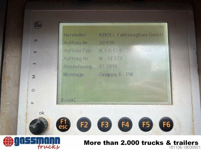 Vehicle location: Bovenden, mtl. house, 2x comfort seat, seat heating, electric mirror, heated mirror, electric window left, electric window right, air conditioning, sun visor, cruise control, electric glass roof, ABS (anti-lock braking system), traction control (ASR), constant throttle, auxiliary drive, exhaust raised, automatic, fog lights, rotating beacon, storage box, leaf-air suspension, aluminum tank, noise reduction G1, last axle hydr. steered, U-protection, aluminum side bumpers, radio remote control, green environmental badge