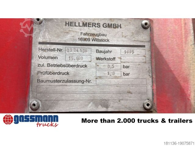 Wheelbase: 5100 mm Body: Hellmers 15,600l tank, MP2 front axle 9.0t, Telligent trailing axle, hydraulically steered, disc brakes on front and rear axles, comfort cockpit, Telligent automatic transmission II, leading axle 7.5t, hydraulically steered, load-relieving. ACCESSORIES INFORMATION WITHOUT GUARANTEE. Subject to changes, prior sale, and errors!