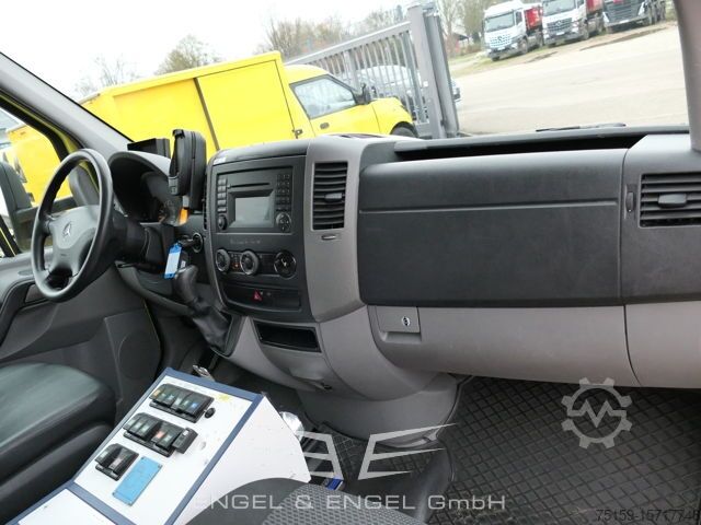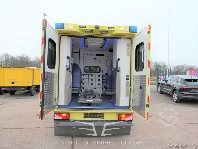The Mercedes-Benz Sprinter II 516 CDI is a used ambulance with automatic transmission and Euro 5 emissions standard. The vehicle was first registered on May 30, 2013 and has a mileage of 230,870 km. The diesel engine with a displacement of 2,143 cc produces 120 kW (163 hp). The car stands out in terms of color with its yellow-red daylight fluorescent color. Special features include air conditioning, Eberspächer auxiliary heating and bi-xenon headlights with cornering lights. The Sprinter offers reinforced front and rear axles, a 75-liter fuel tank and twin tires on the rear axle for greater stability. In the interior it is equipped with an Audio 20 radio, adjustable exterior mirrors with integrated indicators and a heat-insulated driver's cabin.