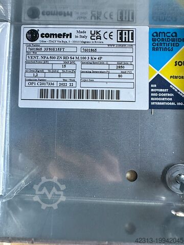 Радиальный вентилятор высокой производительности Comefri с изогнутыми назад лопастями полого профиля. Температурный диапазон эксплуатации: от -20°C до +85°C. Воздушный поток: 14 000 м³/ч, мотор 3 кВт, 400 В, Y/50 Гц, 1450 об/мин. Новый, в оригинальной упаковке, доступен в различных размерах и количествах.