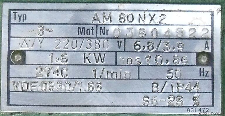 электродвигатель, трехфазный двигатель -Мощность: 1,6 кВт -Скорость: 2740 об/мин Noc R Neb A R Scsc Ifnswh -Диаметр вала: 20 мм -Дизайн: B5 -Класс защиты: IP 44 -Количество: 2x Доступно -Цена: за штуку -Вес: 20 кг