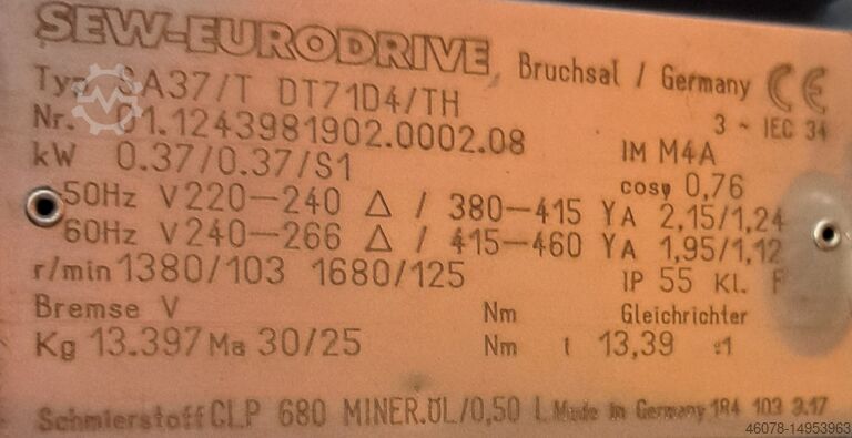 Привод: мотор-редуктор SEW, SA37/T DT71D4/TH