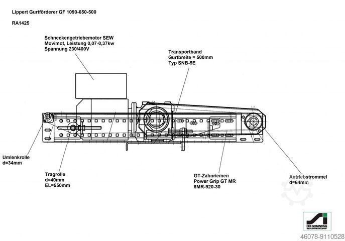Ленточный конвейер Lippert 2001 года выпуска, находится в хорошем (подержанном) состоянии. Ленточный конвейер оснащен двигателем SEW с частотным преобразователем MOVIMOT для регулирования скорости. По запросу и за дополнительную плату могут быть установлены боковые направляющие и/или световые барьеры. Опоры не входят в комплект поставки. Они поставляются по запросу.