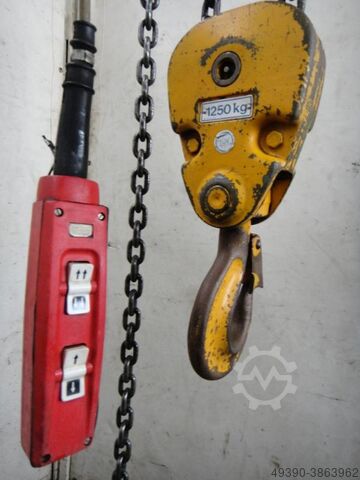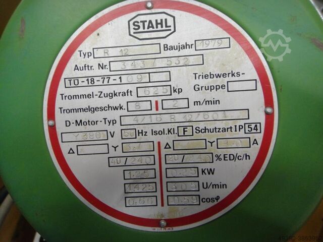 Электрическая цепная таль, электроподъемник, кран STAHL тип R 12 Заводской №: 3437532 Год выпуска: 1979 Грузоподъемность: 1250 кг Ход крюка: 2,4 метра Скорость подъема при одной грузовой цепи: 8 м/мин. Точная скорость подъема при одной грузовой цепи: 2 м/мин. Скорость подъема при двух грузовых цепях: 4 м/мин. Точная скорость подъема при двух грузовых цепях: 1 м/мин. 2 грузовые цепи = 1250 кг Мощность двигателя: 1,25 / 0,25 кВт Подключение: 380 В, 50 Гц - без мешка для цепи - Каретка для KBK 2 – двухбалочный мостовой кран, мостовой кран В хорошем состоянии