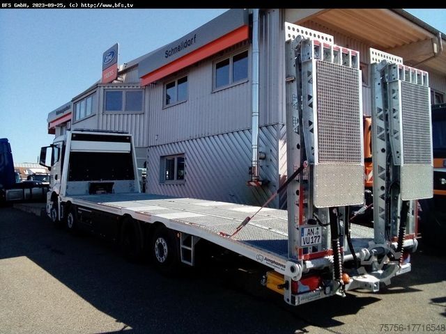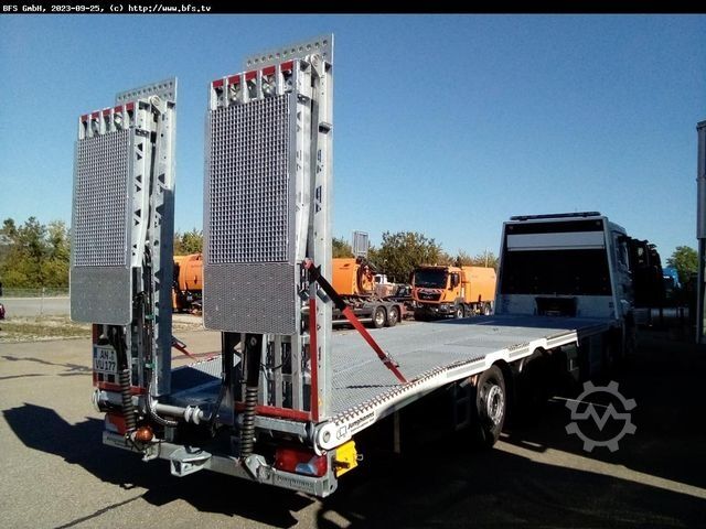 Special confirmation for heavy-duty/municipal operation i=2.53 Full brake assist, roll-away lock, emergency brake signal, acoustic reversing alarm, OBD-E, idle speed driving, free swing, straight trailing axle - steered and liftable, emergency steering pump, digital axle load indicator for air-sprung axles and trailers Driver's comfort seat with heating and armrest, multifunction steering wheel, Basic instrument cluster, Moon Grey, refrigerator, ASR, 7" navigation system, sound system, KSM module and FMS interface PTO gearbox-dependent (continuous operation + shiftable) Type NH/1c without flange, f=0.76, position approx. 2:30 o'clock Transmission shift blocking during power take-off operation Body weight basic version approx. 4400kg 14 lashing eyes + towing rings - tractive force 10000kg recessed in the outer frame, outer frame clad with aluminum checker plate over the entire length, 2 hydraulic drive-on ramps 2-piece - approx. 4350mm long - approx. 850mm wide, hydraulic cable winch approx. 6.3 t tractive force with radio remote control, 2x aluminum tool box, LED light bars