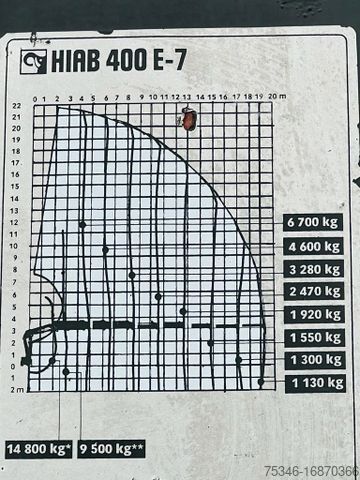 Assembly loading crane Hiab 400 E-7 - with 7 hydraulic extensions, 1 mechanical extension up to 24 meters high, radio remote control, 4-way hydraulic support and a 2.5 ton cable winch.