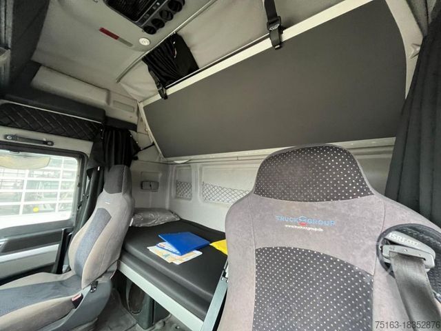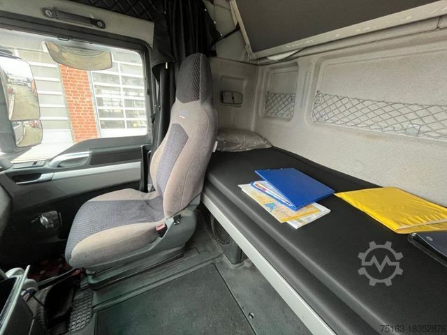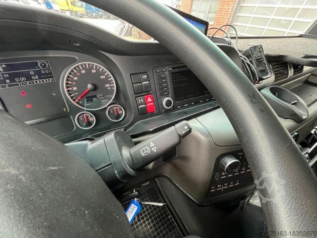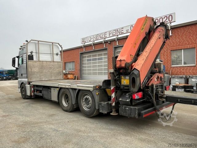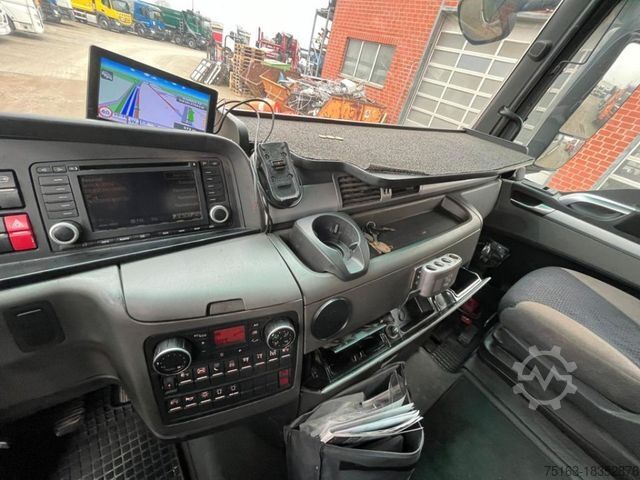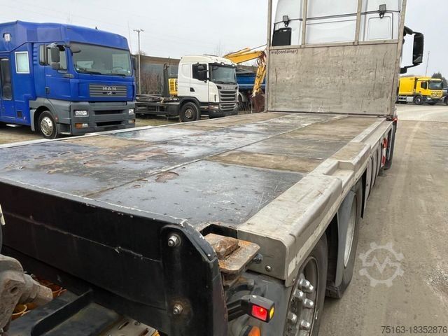 ----Special structure: Crane: Palfinger PK 34002-SHB (Power Link Plus), load capacity max. 10,000 kg, foldable, radio remote control, 3-way hydraulic extension (working height approx. 13.4 m), fully hydraulic 4-point support, oil cooler. Load diagram read: Lifts at 4.2m-7.5t, 6.1m-5.1t, 8m-3.8t, 10.1m-3t.----Construction: Open platform (loading height approx. 1,180 mm), high front wall, hardwood/steel floor, 2 extendable container locking pairs (Twist Lock).----EEV Class 1