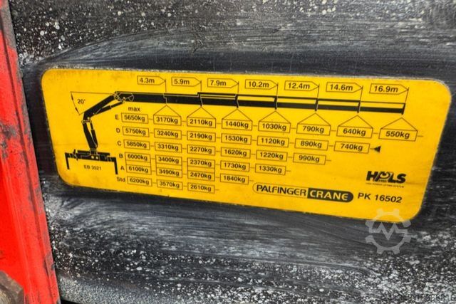 Crane: ----- Retarder - Air conditioning - Lift and steering axle - Aluminium floor - Palfinger PK16502 crane - Radio remote control Suspension: Leaf-air