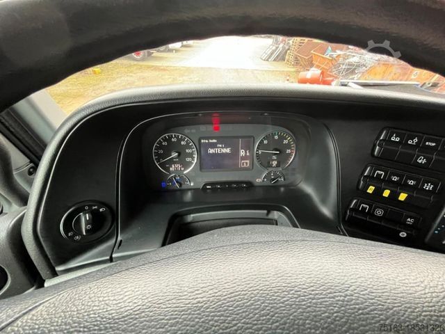 ----Special structure: Crane: Palfinger PK 34002-SHB (Power Link Plus), load capacity max. 10,000 kg, foldable, radio remote control, 3-way hydraulic extension (working height approx. 13.3 m), fully hydraulic 4-point support, oil cooler. Load diagram read: Lifts at 4.2m-7.5t, 6.1m-5.1t, 8m-3.8t, 10.1m-3t.----Construction: Open platform (loading height approx. 1,120 mm), high front wall, hardwood/steel floor, 2 extendable container locking pairs (twist lock).