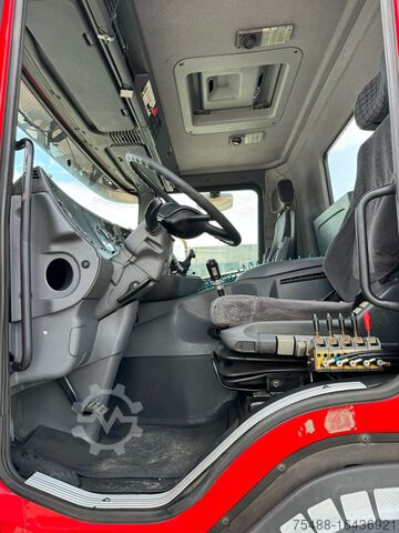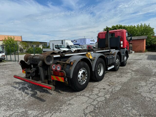 INFO ENG: Used truck Scania 124 G 420 Tam 32 T. hooklift, 4 axles 8x2, first registration 12/2002, short cabin, manual gearbox, 1st + 2nd axle mechanical leaf spring suspension, 3rd + 4th axle air suspension, 4th axle liftable + steering, total weight 32,000 kg, air conditioning, engine brake, ABS, euro 3, tire size 315/80 R 22.5, sun visor, electric mirrors + windows, radio, 940,000 km, good condition.