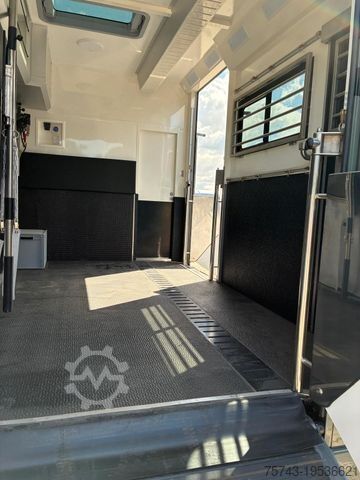 5 horses, side and rear ramp, slide-out, pop-up, lower kitchen, basement under the living quarters, external storage compartments all around the truck, 6 kW diesel generator, 550-liter fresh water tank, 300-liter waste water tank, 5-6 sleeping berths, living area, extra-large bed over the bathroom, rear entry door, video surveillance and temperature monitoring for the horse compartment.