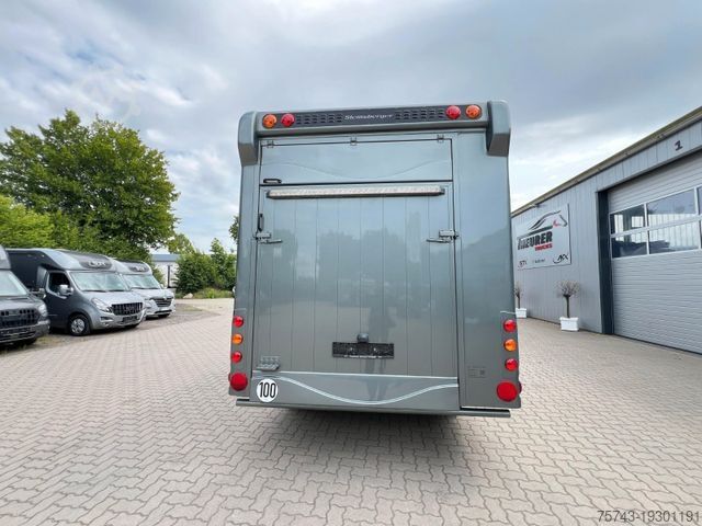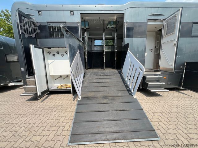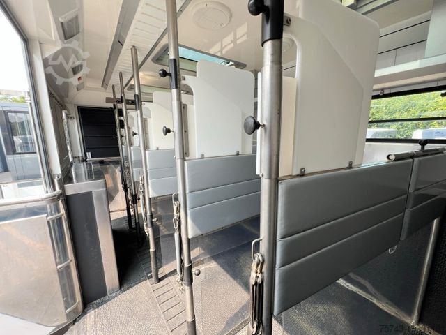 6 horses, side and rear ramp, double pop-out, basement under the living area, storage compartments all around the truck, 6 KW diesel generator, 550 liters fresh water, 300 liters grey water,