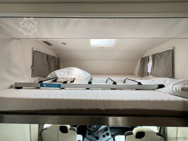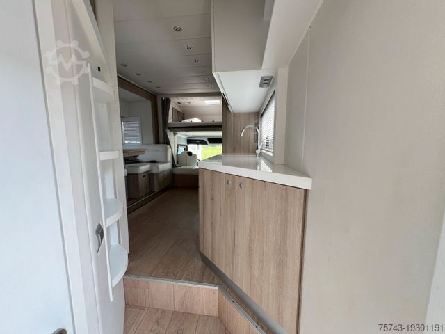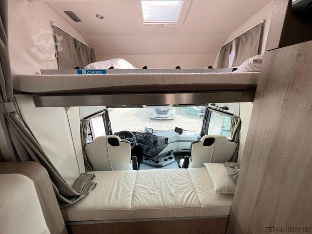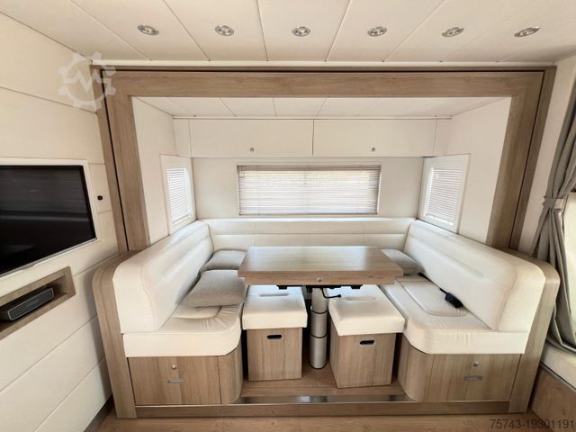 LG stationary air conditioning, auxiliary heater, 2 TVs/Sat, precious wood, bathroom, shower, WC, air conditioning, kitchen, leather seating group, microwave, refrigerator and freezer, dishwasher, external saddle closet, winch, cruise control, light alloy wheels, navigation system, air suspension, steerable rear axle, tow hitch, and much more.