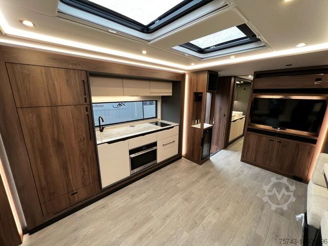 LG parking air conditioning, Kabola water heater, 2 TVs/satellite, fine wood, bathroom, shower, toilet, air conditioning, kitchen, leather seating group, microwave, refrigerator and freezer, dishwasher, washing machine, external cruise control, alloy wheels, navigation system, air suspension, steerable rear axle, trailer hitch, and much more.