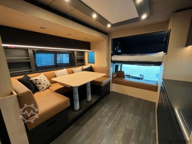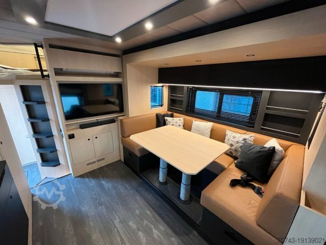 LG auxiliary air conditioning, auxiliary heating, 2 TVs/satellite, fine wood, bathroom, shower, toilet, air conditioning, kitchen, leather seating area, microwave, refrigerator and freezer, dishwasher, external tack cabinet, cable winch, cruise control, alloy wheels, navigation system, air suspension, steerable rear axle, tow bar, and much more.