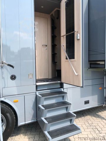 6 horses, side and rear ramp, dop-pop-out, pop-up, cellar under apartment, storage compartments around the truck, 6 KW diesel generator, 550 liters of fresh water, 300 liters of waste water,