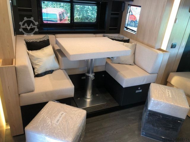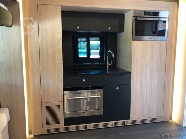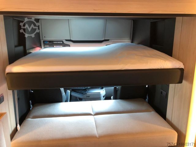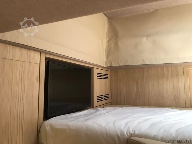 LG auxiliary air conditioning, auxiliary heating, 2 TVs/satellite, fine wood, bathroom, shower, toilet, air conditioning, kitchen, leather seating group, microwave, refrigerator and freezer, dishwasher, external saddle cabinet, cable winch, cruise control, alloy wheels, navigation system, air suspension, steerable rear axle, trailer hitch, and much more.