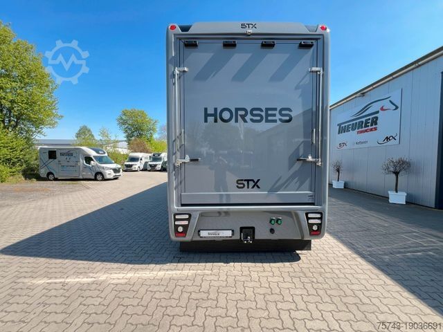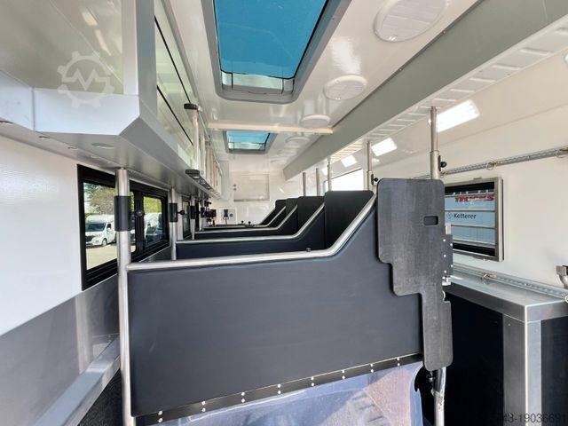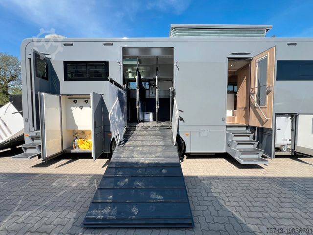 6 horses, side and rear ramp, pop-out, pop-up, kitchen downstairs, cellar under the apartment, storage compartments around the truck, 6 kW diesel generator, 550 liters of fresh water, 300 liters of waste water, 5-6 sleeping spaces, living room, extra large bed above the bathroom, extra groom's bed, rear entrance door, video surveillance and temperature monitoring for the horse compartment,