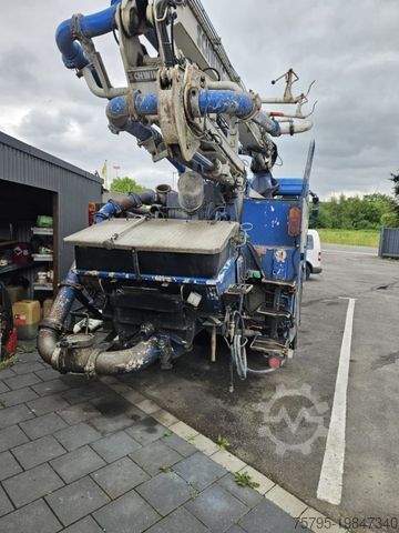--- Bodywork: Schwing concrete pump S 24 X, P 2023-110/75 RB, 4 sections, Z-fold, 4 arms, distribution boom M 24-4, max. vertical reach 23.5 m, max. horizontal reach 19.5 m, slewing range 370°, end hose length: 3 m/125DN, delivery pipeline (pipe DN) 125, max. delivery rate 96 m³/h, max. delivery pressure 80 bar, min. unfolding height 4.89 m, radio remote control, cable remote control + ground control, fully hydraulic 4-point outrigger support, oil cooler. Indicated operating hours:--- Low unfolding height, also ideal for indoor/hall use!