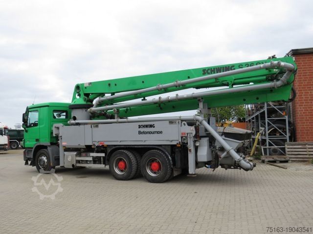 ----Body: Schwing concrete pump P2023-110/75 RB, 4 articulations, Z-fold, 4 arms, S36X placing boom, max. reach height 35.2 m, max. reach 31.25 m, end hose length: 4 m, delivery line (pipe diameter) 125 mm, max. delivery rate 96 m³/h, 380 l/min, 80 bar, radio remote control, cable remote control + floor control, fully hydraulic 4-point outriggers, oil cooler. Operating hours: Pump 2,786 h, boom 3,595 h. German pump - first owner - tested by Schwing - top condition, ready for immediate use, last test by Schwing in February 2025.