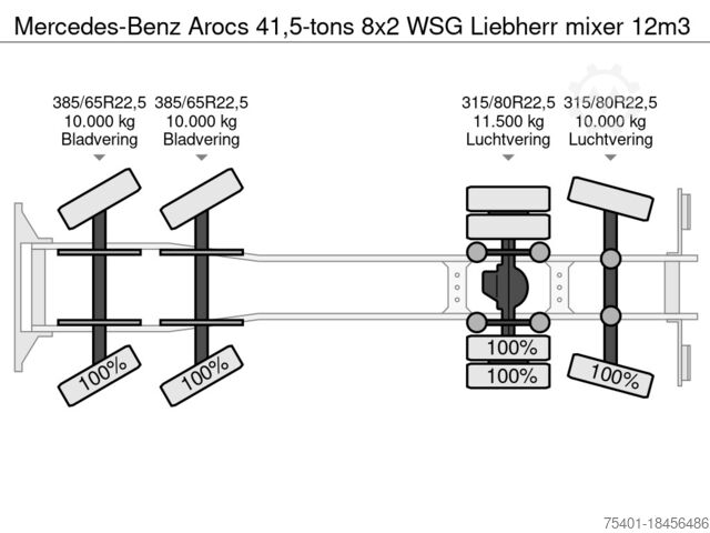 Rear axle 1: Tire size: 315/80R22.5; Twin tires; Max. axle load: 11500 kg; Tire profile left inside: 100%; Tire profile left outside: 100%; Suspension: air suspension