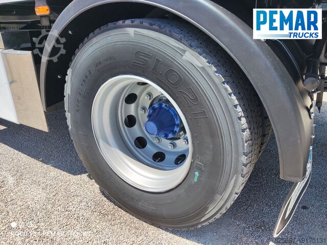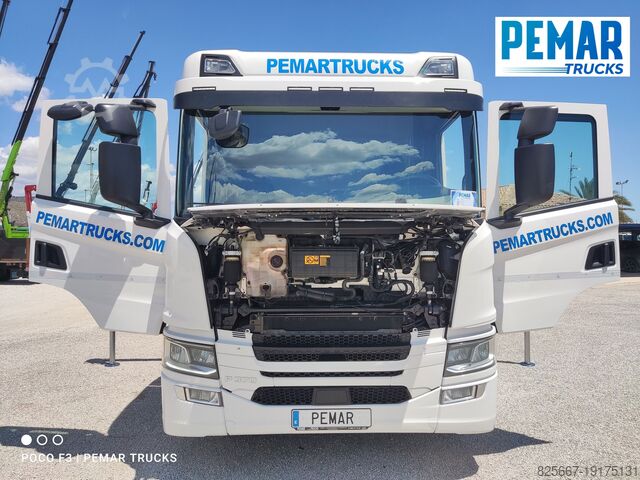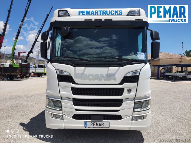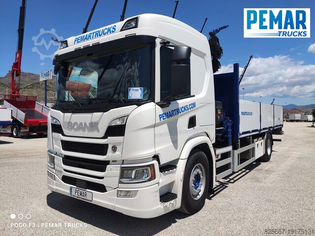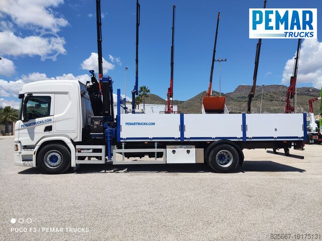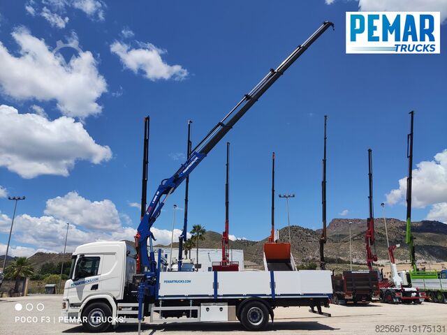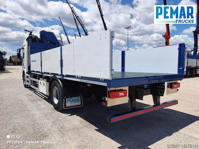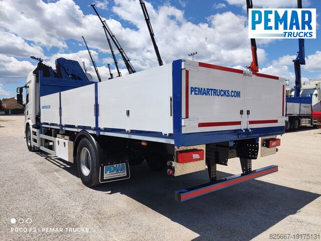 Ref.: 2946. Бортовой грузовик 4X2 марки SCANIA модель P 370, оборудован краном HIAB X-HIDUO 188 E-5 с 5 гидравлическими выдвижениями (возможность добавить еще), наработка крана 1.600 часов, высота подъема крана — 18 м вертикально и 15 м горизонтально, грузоподъемность на максимальном вылете — 710 кг, передние аутригеры, EURO 6, ретардер, внутренние размеры кузова: 6,52 м длина X 2,50 м ширина X 0,80 м высота, пол металлический, борта откидные алюминиевые, одна спальная полка, автоматическая коробка передач, кондиционер, радиоуправление краном, рессорная подвеска, размеры шин: первая ось 385/65r22.5, вторая ось 295/80r22.5, колесная база 5,75 м, полная масса 18.000 кг, полезная нагрузка 7.500 кг,... в отличном состоянии!