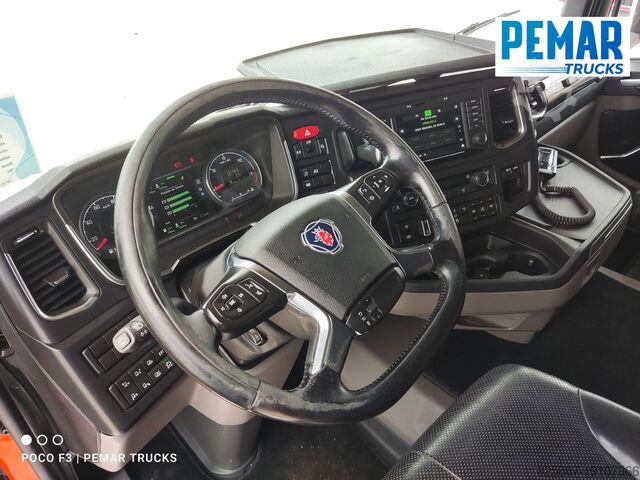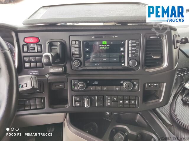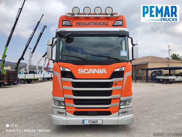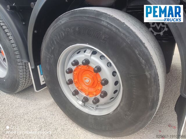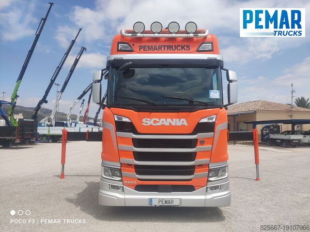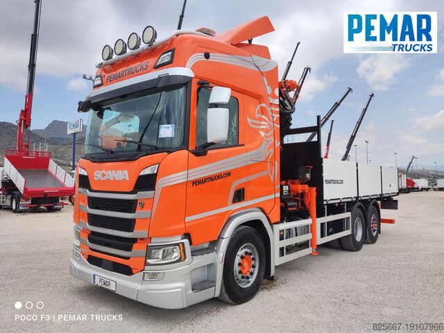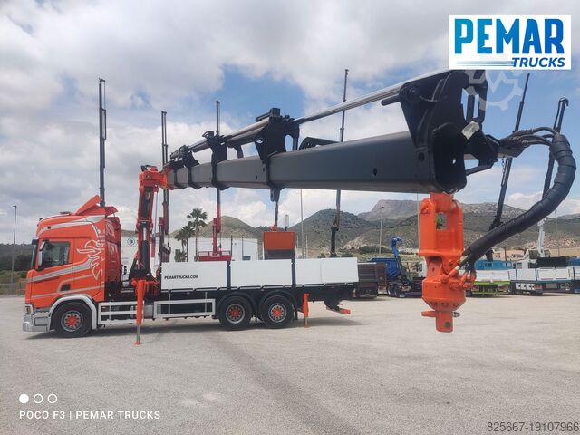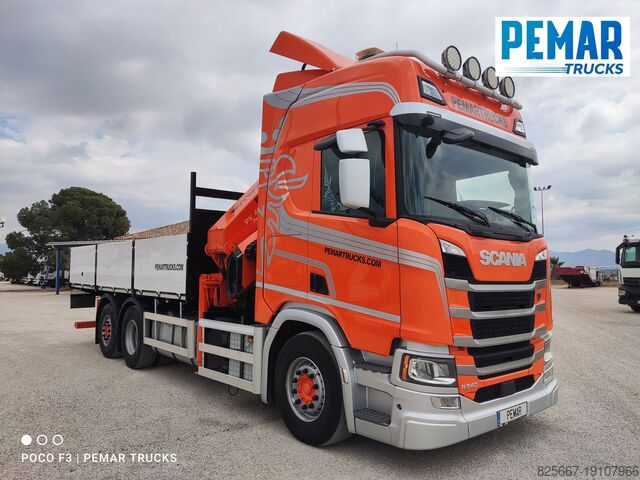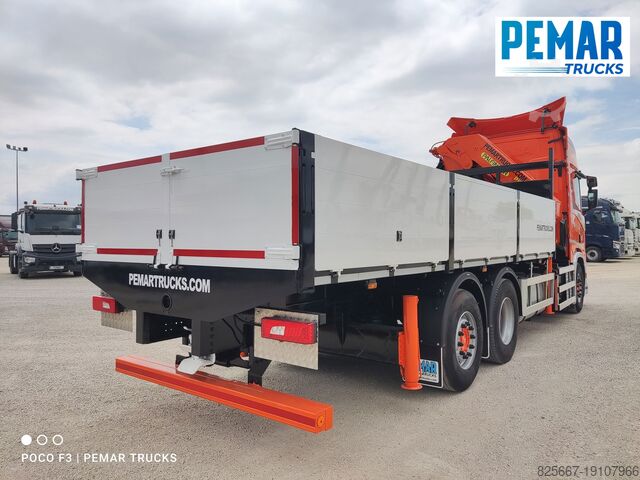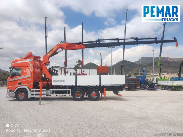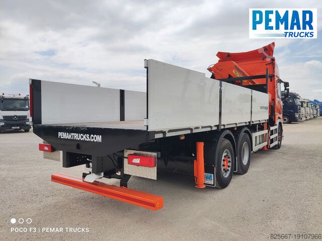 Реф.: 2923. Жёсткий грузовик 6x2 марки SCANIA, модель R 540, EURO 6, оснащённый краном PALFINGER модели PK 42502 с 5 гидравлическими удлинителями (возможна установка дополнительных гидравлических или механических удлинителей, имеем JIB для этого крана), дистанционное радиоуправление, высота подъёма крана 17 м, вылет по горизонтали 14,3 м, грузоподъёмность на максимальном вылете 2 440 кг, передние и задние стабилизаторы, открытая стационарная платформа с внутренними размерами 6,29 м длина x 2,54 м ширина x 0,80 м высота борта из алюминия, пол из листовой стали, автоматическая коробка передач, кондиционер, одна спальное место, передняя и задняя камеры обзора, 3-я ось подъемная и управляемая, полная пневмоподвеска, размеры шин: 1-я ось 385/65R22.5, 2-я ось 315/80R22.5, 3-я ось 385/65R22.5, колесная база 4,75 м, полная масса 26 000 кг, полезная нагрузка 10 000 кг,... в идеальном состоянии!!!