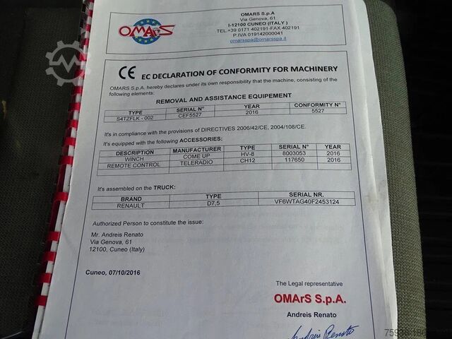 Renault D 180 tow truck, Euro 6, from 10-2016 with 127,700 km. Hydraulic recovery wheel lift with remote control. This Renault is in good condition both technically and visually.
