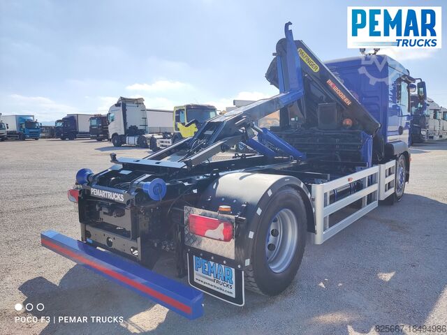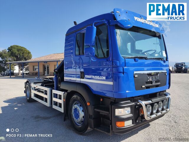 Ref.: 2917. Грузовой автомобиль с жесткой рамой 4X2, марки MAN, модель TGM 18.290, EURO 5, оборудованный краном марки PALFINGER, модель PK 12002, с 4 гидравлическими удлинителями, вертикальные размеры крана составляют 15,50 м в высоту и 12 м в горизонтали, вес оголовка 730 кг, радиоуправление краном и крюк MULTILIFT марки JOAB грузоподъемностью 12 тонн (для кузовов длиной до ок. 4,50 м), длина до центра роликов 3,70 м, ширина от ролика до ролика 1,07 м, высота до центра крюка 1 м, автоматическая коробка передач, 1 спальное место, кондиционер, камера заднего вида, встроенная пневмоподвеска, размер шин 315/70r22.5, колесная база 4,75 метра, полная масса 18 000 кг, полезная нагрузка 9 000 кг ... в идеальном состоянии !!!
