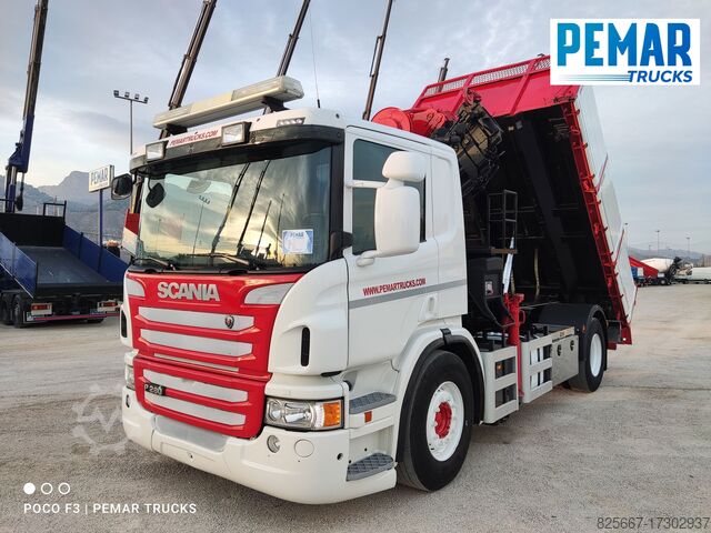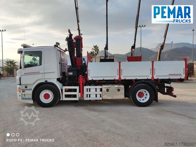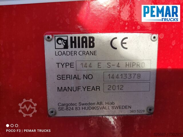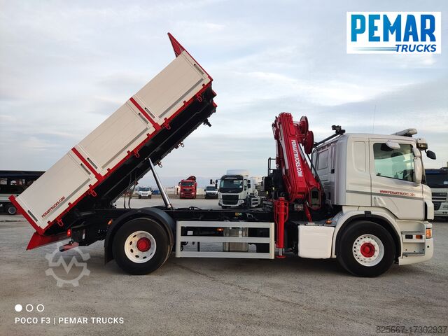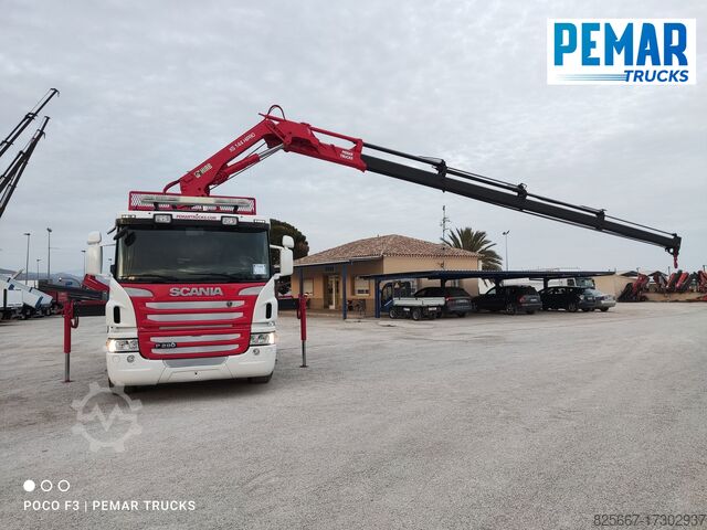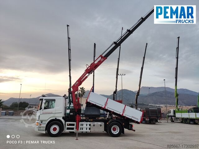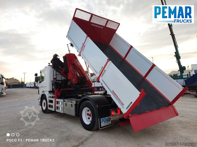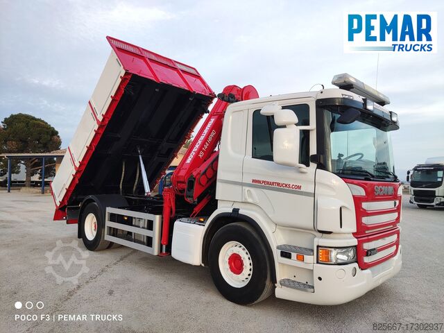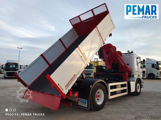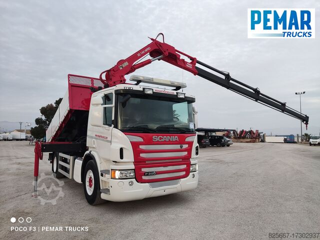 Ref.: 2836. Грузовик с колесной формулой 4х2 марки SCANIA модель P 280, EURO 6, оборудован краном марки HIAB модель 144 ES-4 HIPRO, с 4 гидравлическими удлинителями (возможность добавления еще нескольких), размеры крана по вертикали 14,5 м и по горизонтали 12,50 м, самосвальный вес 880 кг, дистанционное радиоуправление, передние стабилизаторы, самосвальный ящик с полом из листового металла, внутренние размеры 4.40 м в длину x 2.52 м в ширину x 0.70 м в высоту, автоматическая коробка передач, кондиционер, передняя рессорная подвеска и задняя пневматическая подвеска, передние шины размером 385/65R22.5 и задние 315/80r22.5, колесная база длиной 4.30 м, PMA 18.000 кг, грузоподъемность 7.500 кг,...в отличном состоянии!!!!