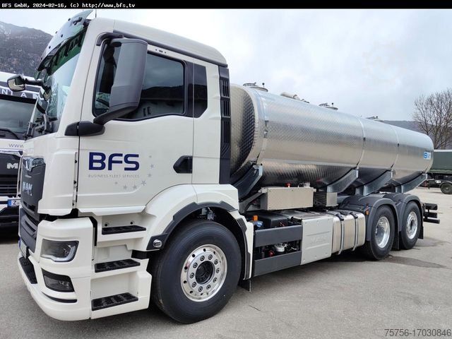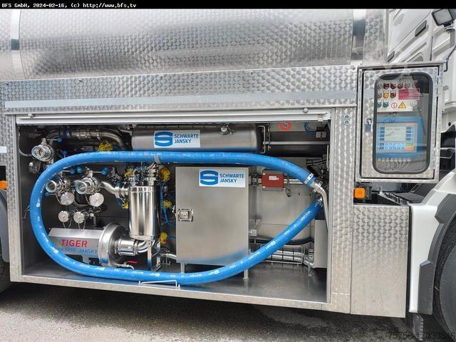 Contact person for all matters: Stefan Schweiger - BFS Garmisch, trailer coupling 40 mm, heated driver's seat, 2 additional air tanks 40 liters, exhaust on the left side, reversing camera + preparation for trailer, socket for overflow protection for tank trailer, retarder 6-stage, automatic wiper, ZV with remote control, high beam assistant. Hydraulic measuring system type TIGER: suction capacity max.2000l/min,16.000l tank insulated (3x 5.333l) tank dome 3xDN430, outlets 3xDN80 with vortex breaker,suction hose length 5,5m - reception cabin width 2,50 m as well as pneumatic roller shutter. Joint wrench 1xDN60-DN90 & 1x DN90-DN155 Sampling ULTRASAMPLER: (double sampler with total tank sample) for up to 20 sample bottles. Data acquisition: BARTEC MAK 3003 Type:6942-10 Ser.A - GPS Supplier identification:GPRS Data transmission up to 4 dairies, temperature monitoring sample compartment