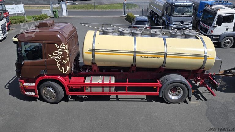 Manufacturer: Scania - Type/Model: P 440 4x2 - First registration: 15.10.2013 - Mileage: 600,331 km - Number of axles: 2 - Emission standard: Euro 5 - Cab: L - Transmission: manual gearbox - Continuous brake: retarder - Suspension: leaf/air - Brakes: disc - Length: 8,602 mm - Width: 2,550 mm - Height: 3,178 mm - Unladen weight: 9,393 kg - Body manufacturer: T+A - Tank material: stainless steel - Total tank volume: 9,129 L - Number of tank compartments: 6 (2,010 / 1,012 / 1,004 / 2,030 / 1,028 / 2,045 L) - CIP cleaning system